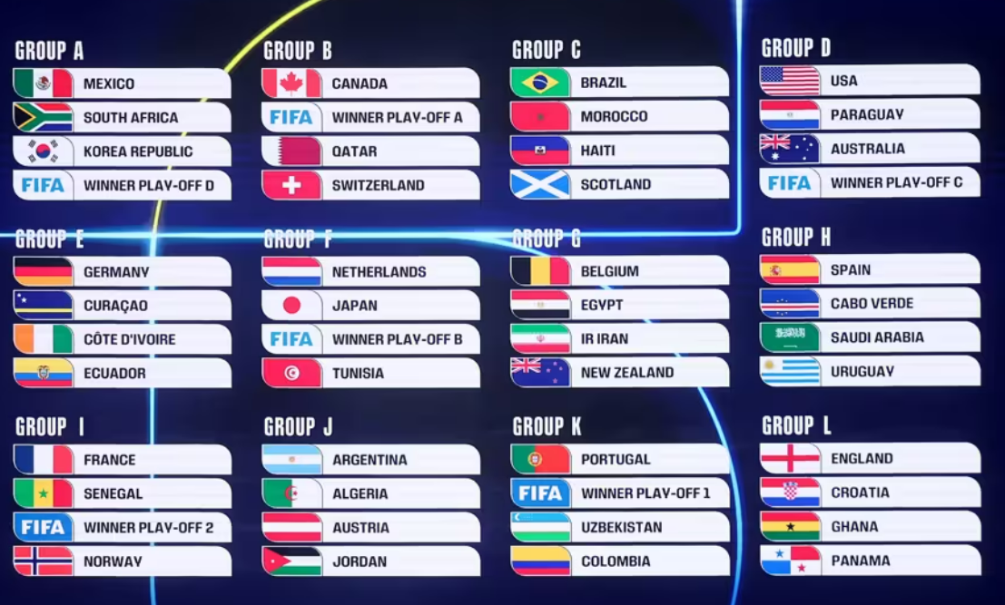 총 12개의 조는 강호와 신흥 강팀이 혼재되어 있으며, 아시아·아프리카·유럽·남미·북중미의 다양한 축구 스타일이 조별리그에서 충돌할 예정입니다. 특히 일부 조는 유럽 강호와 남미 강호가 함께 배정되며 ‘죽음의 조’라는 평가를 받고 있습니다.