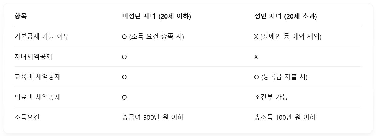 - 소득이 없다면 (100만 원 이하), 만 20세 초과라도 공제 가능할 수 있음 (단, 기본공제는 불가하나 부양가족으로 인정될 수 있는 특수 사례 있음)