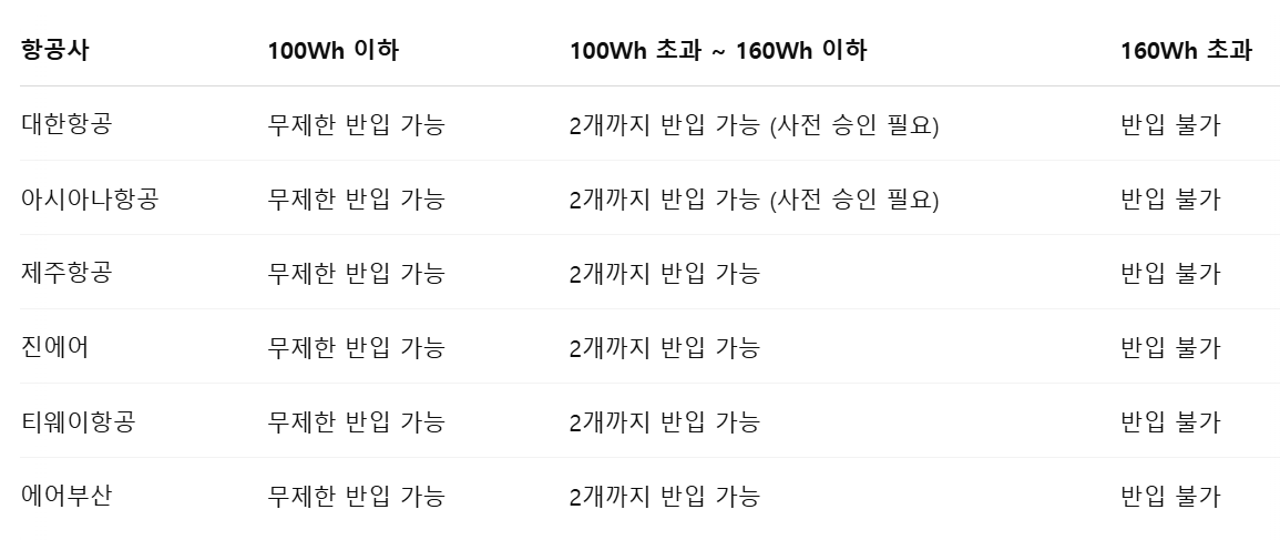 📌 항공사별 보조배터리 기내 반입 규정