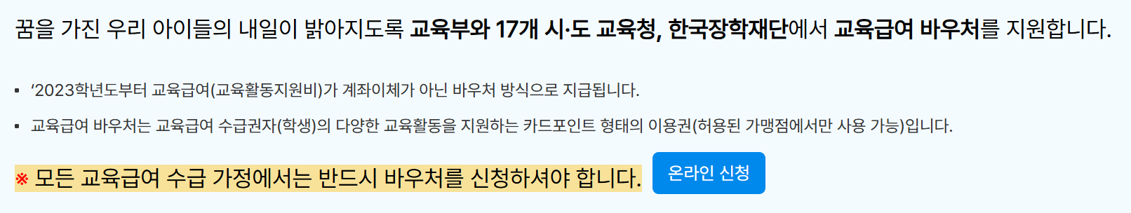 교육급여 바우처는 기초생활수급자 및 저소득층 가정의 학생들이 학업을 지속할 수 있도록 정부가 지원하는 교육 보조금으로 기존의 현금 지급 방식에서 바우처 방식으로 전환되면서, 학습 자료 구매, 학원 수강료, 교재비 등 다양한 용도로 사용할 수 있습니다.