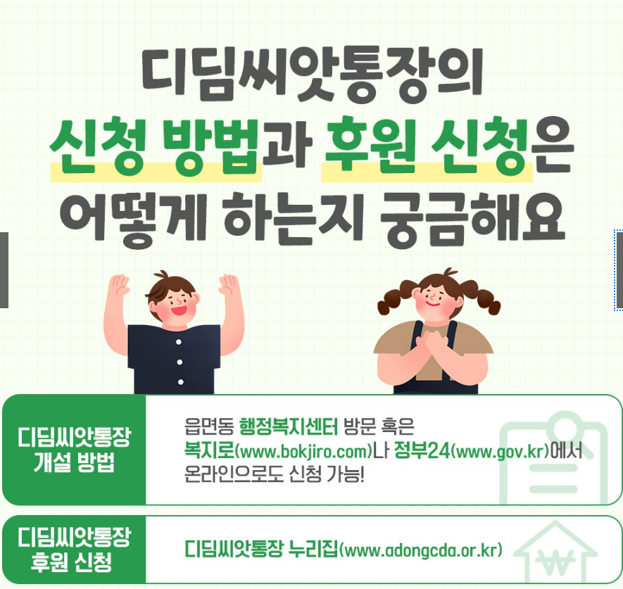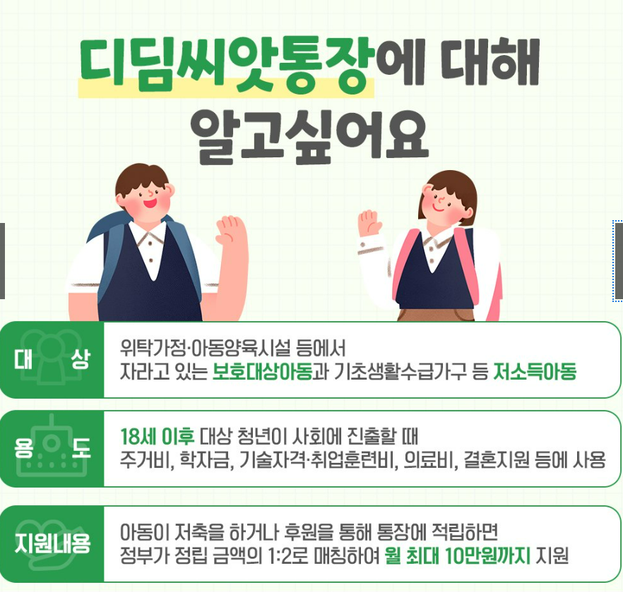 오늘은 디딤씨앗통장에 대해 대상자, 지원 내용, 신청 방법 등 전반적인 내용을 자세히 알아보겠습니다.